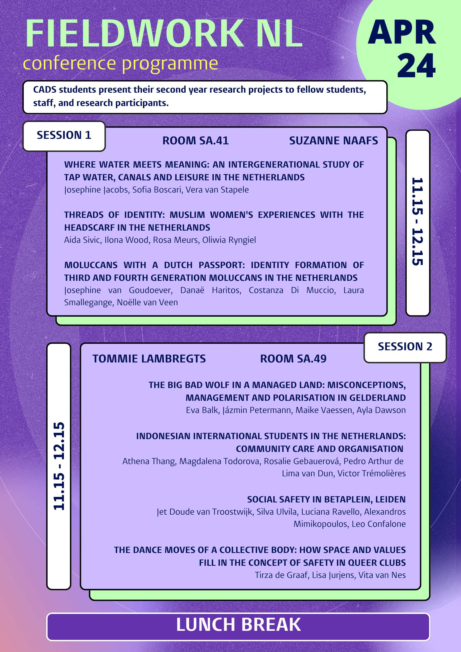 Studenten presenteren hun eigen veldwerkprojecten die zij in Nederland hebben uitgevoerd voor het vak Fieldwork NL. Ze vertellen over hun onderzoeksvraag, hun ervaringen in het veld en de inzichten die ze hebben opgedaan.