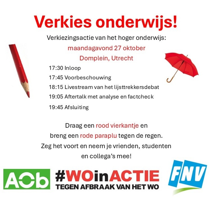 In aanloop naar de Tweede Kamerverkiezingen organiseren WOinActie, FNV Onderwijs en Onderzoek en de AOb op maandag 27 oktober een actiebijeenkomst op het Domplein in Utrecht. Tijdens de bijeenkomst komen diverse sprekers aan het woord en wordt met elkaar gekeken naar het lijsttrekkersdebat van studievereniging EFR en EenVandaag.