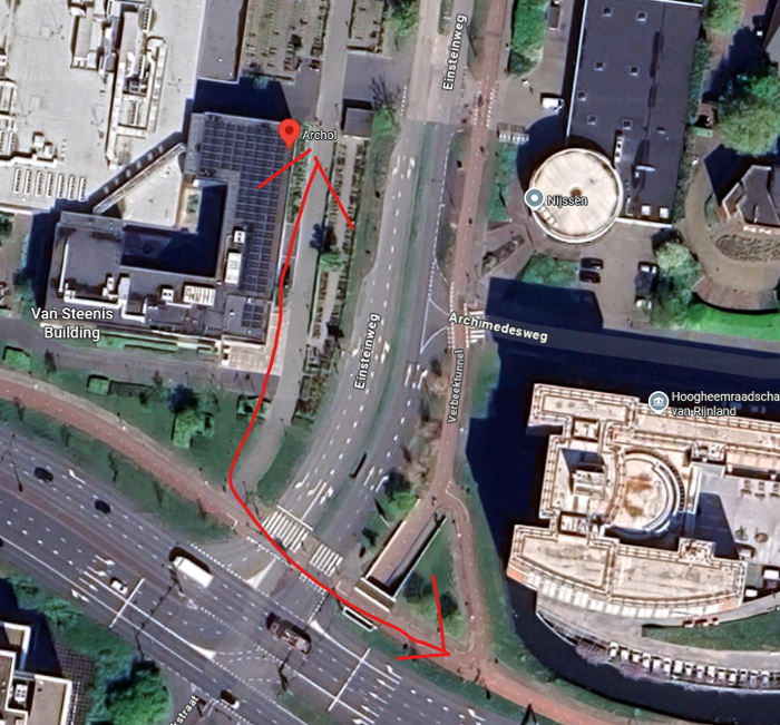 In de week van 13 tot 17 oktober vinden er werkzaamheden plaats op de Einsteinweg tegenover het Van Steenisgebouw. Hierdoor lopen de fietsroutes naar het Van Steenis via het kruispunt met de Plesmanlaan (zie afbeelding).
