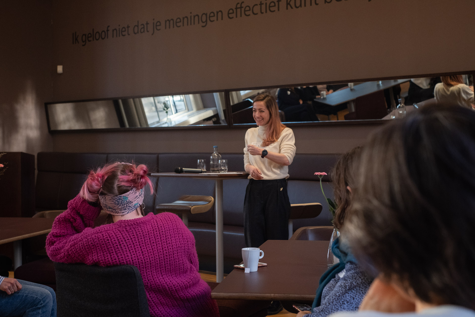 Daarna spraken de deelnemers aan de bijeenkomst in kleine groepjes over hun loopbaan aan de universiteit, hun persoonlijke ervaringen en aanpak en wisselden ze van gedachten over onderwerpen als leiderschap en carrière, zorgen voor jezelf en empowerment. Er kwamen een heleboel zaken naar voren die volgens de vrouwen kunnen worden verbeterd: bias in taalgebruik, de combinatie van een wetenschappelijke carrière en het krijgen van kinderen en het gebrek aan vrouwen als leidinggevende binnen de universiteit. ‘We zijn er nog steeds niet’, concludeerde Bijl dan ook.