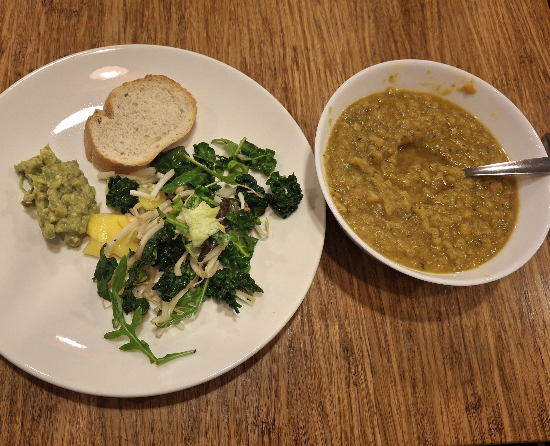 Na de rondleiding schuift het gezelschap aan in de grote kantine waar tientallen studenten aan lange tafels al aan de maaltijd zitten. De rijke linzensoep en kool-taugésalade met een vleugje citroen en guacamole valt in de smaak bij de gasten van de gemeente. Barker, die wethouder is namens de Partij voor de Dieren, merkt op: ‘Het is nu de Nationale Week Zonder Vlees en Zuivel. Als dierenfan is het heel goed om te zien dat het hier altijd vegan is!’