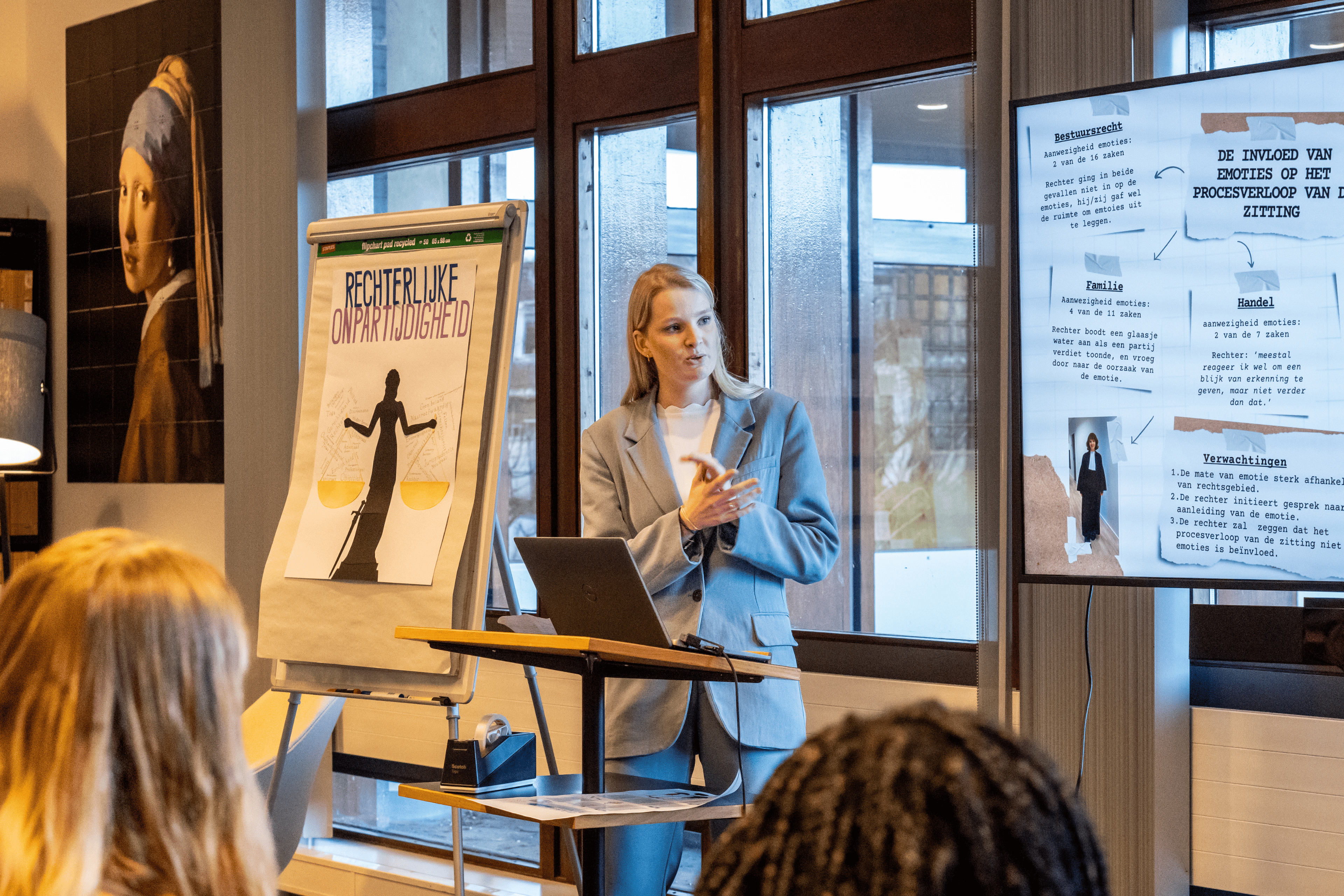 Als onderdeel van het vak ‘Masterclass rechtbank Den Haag’ liepen twaalf rechtenstudenten verdeeld over zeven weken een aantal dagen bij de rechtbank mee met rechters, gerechtsjuristen of juridisch adviseurs. Tijdens de eindbijeenkomst op 13 maart presenteerden zij hun ervaringen.