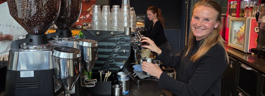 Wat opvalt is dat de barista van veel studenten en medewerkers de koffiebestellingen uit haar hoofd weet. ‘Soms zie ik het al aan de mok. Dan denk ik: ‘Dat is een flat white havermelk’. Ik onthoud het gewoon, ik weet eigenlijk niet hoe ik dat doe. Sommige mensen zie ik natuurlijk elke dag en dan leer je het wel snel. Maar ik ken ook heel veel namen en probeer met iedereen een praatje te maken, even inchecken hoe het gaat. Nu met zoveel nieuwe studenten moet ik weer veel namen en bestellingen gaan leren. Maar mijn collega zegt altijd over mij dat ik elk kopje koffie met liefde maak en dat klopt helemaal.’