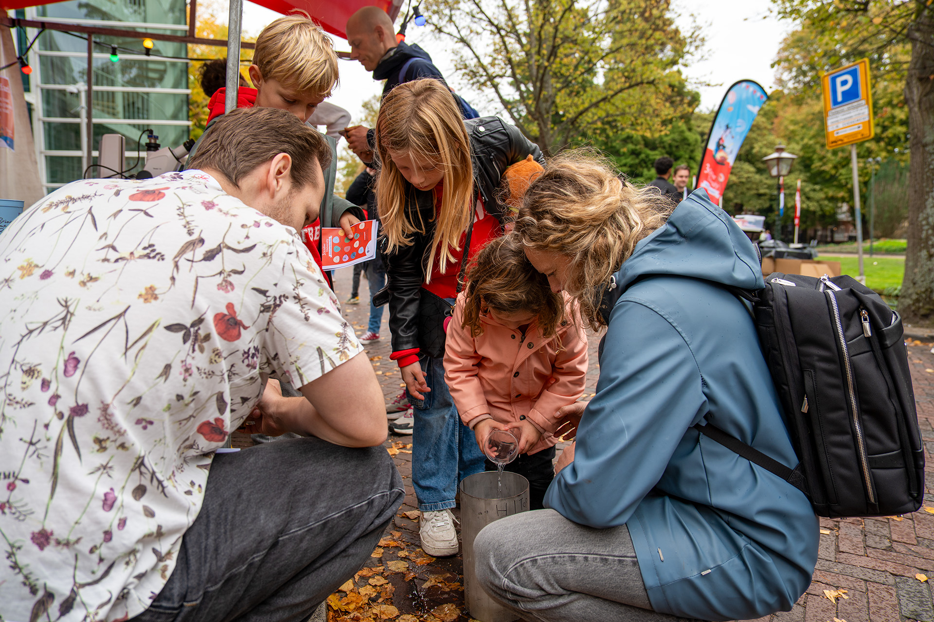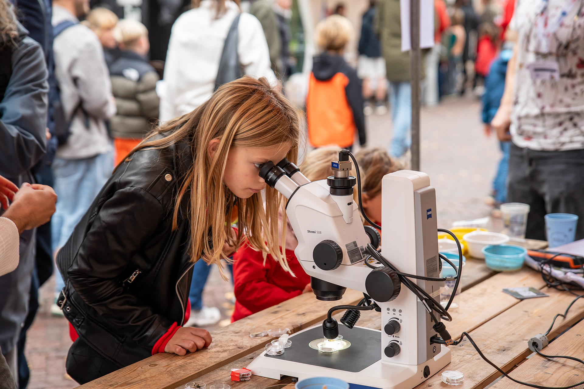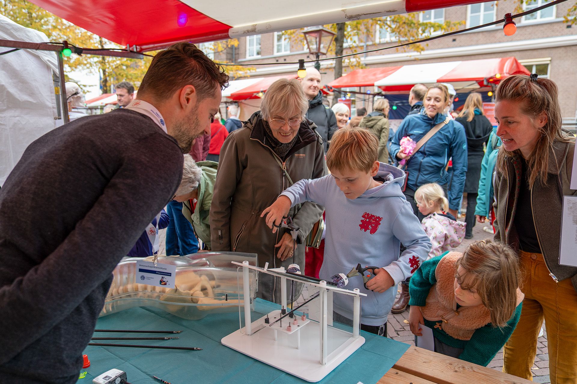Met een stempelkaart in de hand lopen honderden bezoekers langs de veertien marktkramen vol onderzoek die op het Steenschuur staan. Ze turen door een microscoop, horen weetjes over cybersecurity en moleculen, tijdreizen met aardewerk en nog veel meer.