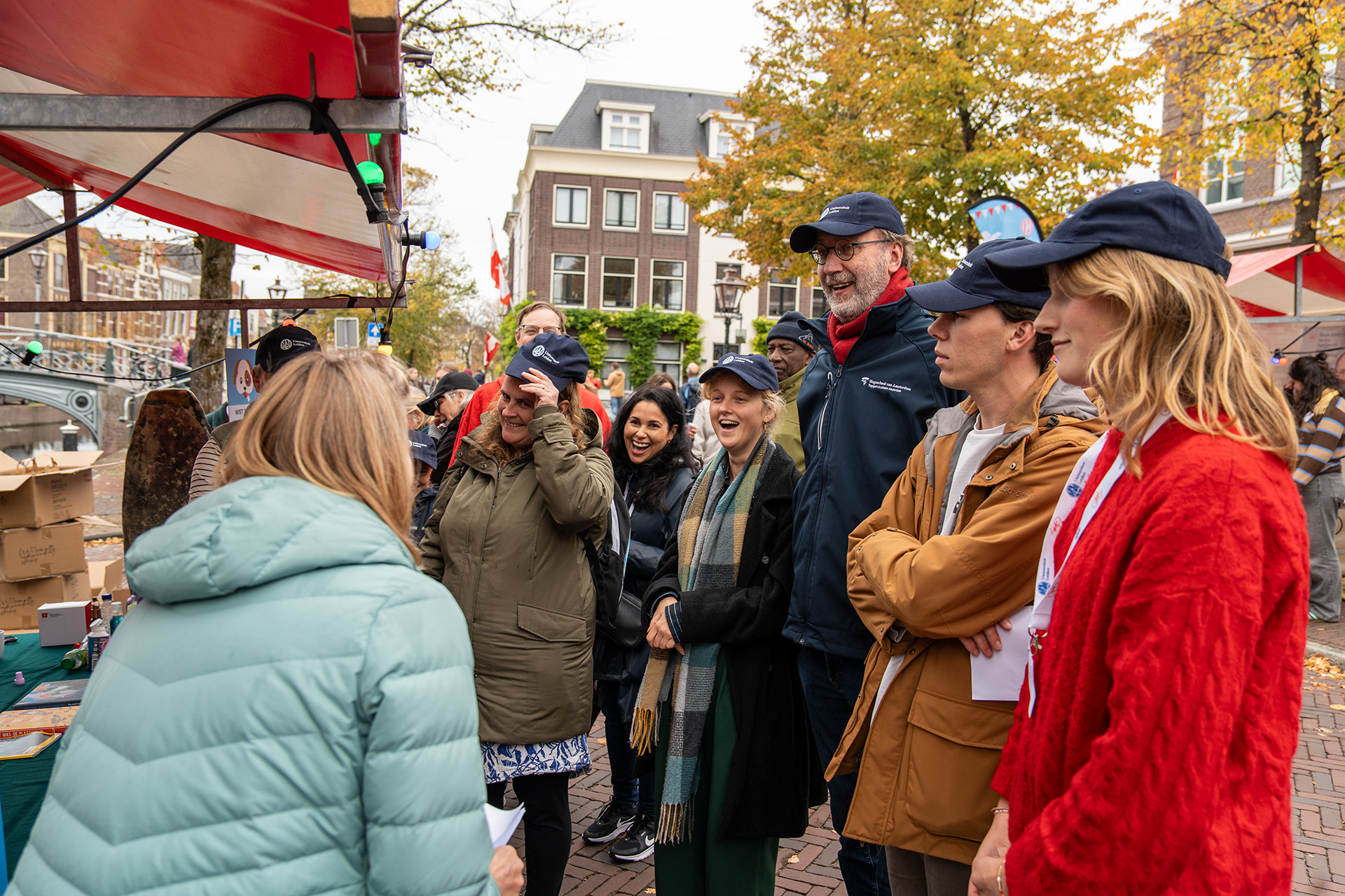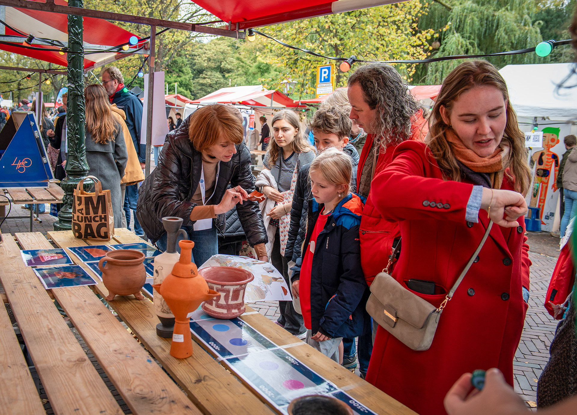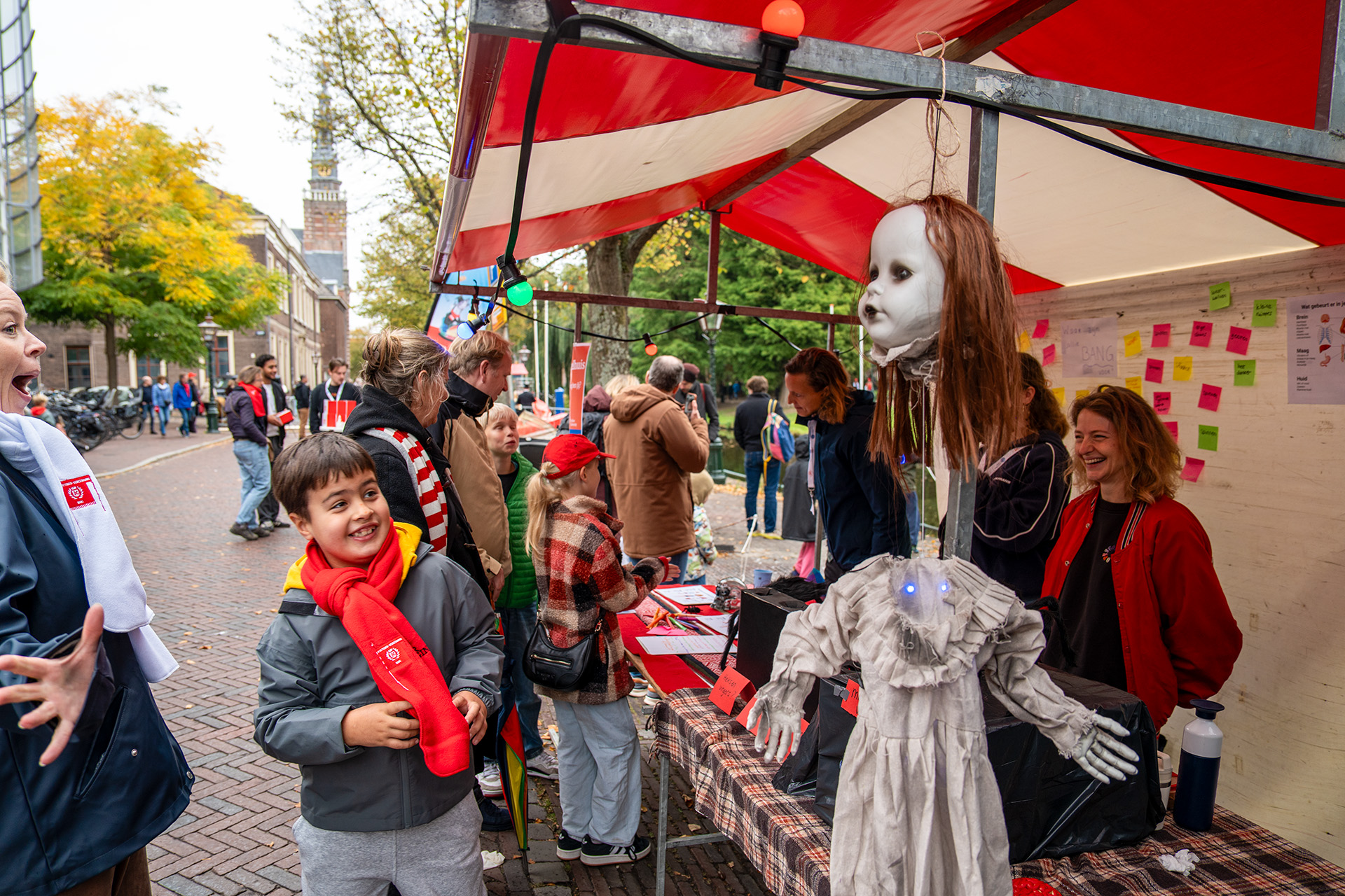 Met een stempelkaart in de hand lopen honderden bezoekers langs de veertien marktkramen vol onderzoek die op het Steenschuur staan. Ze turen door een microscoop, horen weetjes over cybersecurity en moleculen, tijdreizen met aardewerk en nog veel meer.