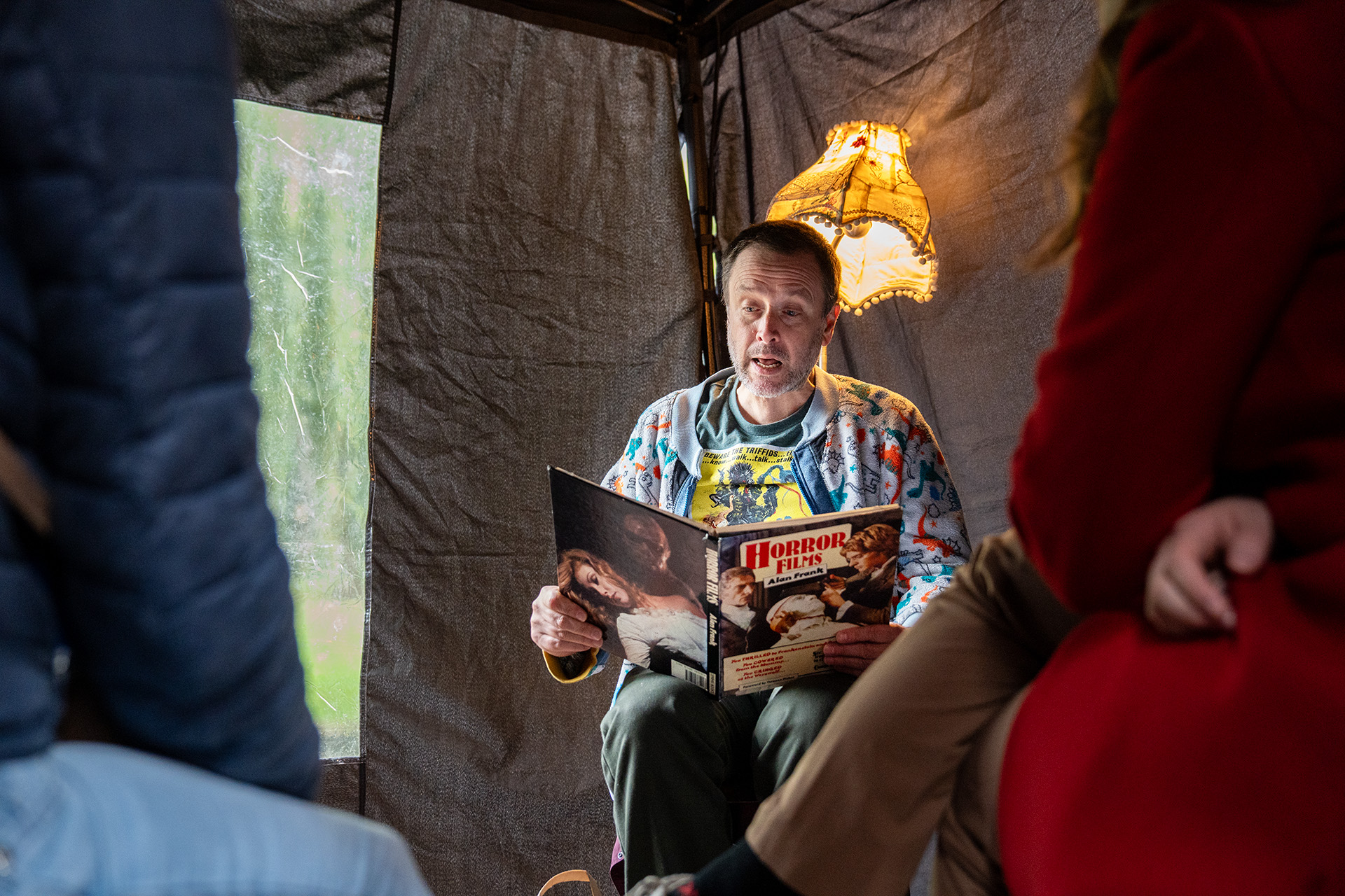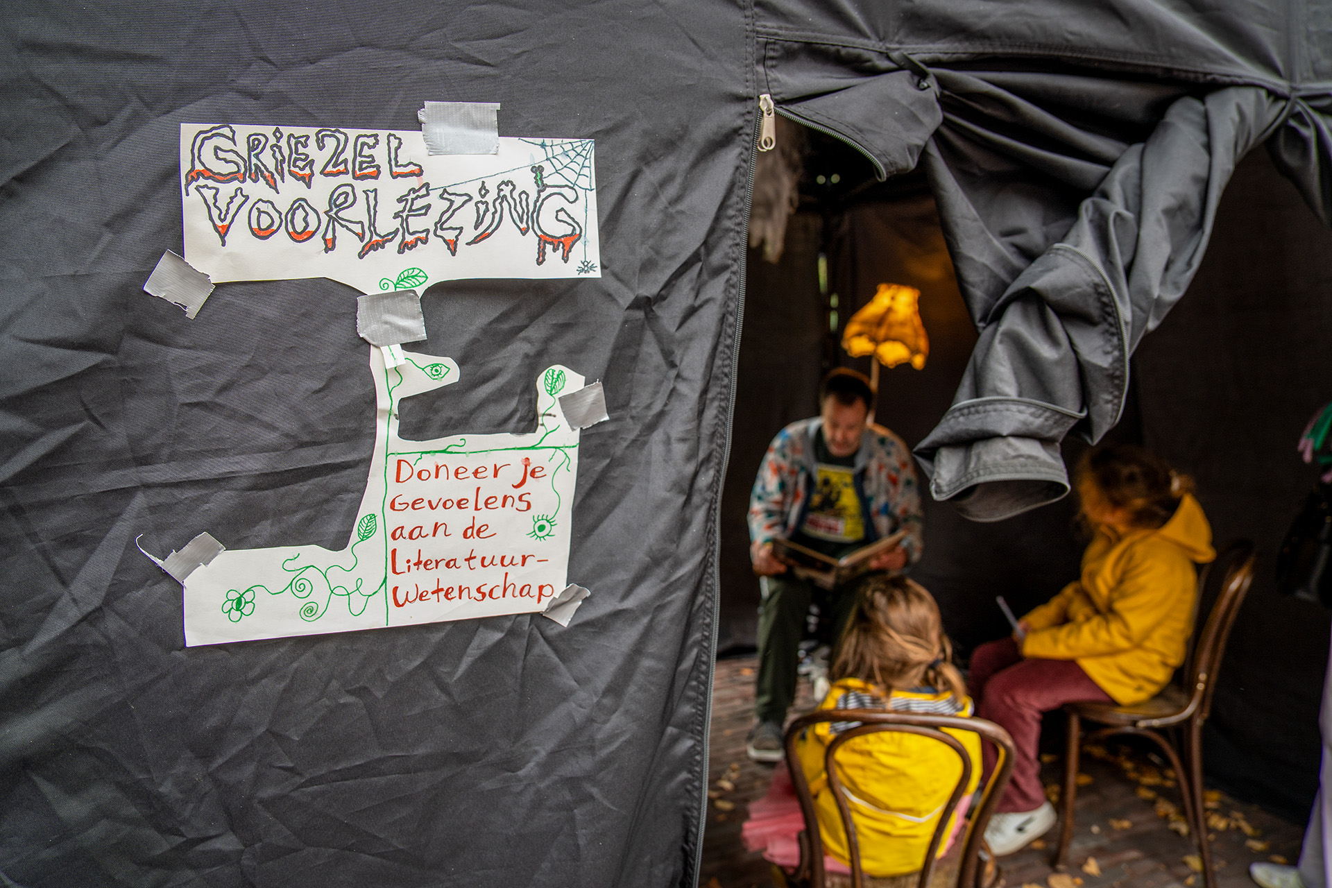 Iets verderop staat een zwarte tent met daarop de tekst: ‘Doneer jouw gevoelens aan de literatuurwetenschap’. Binnen hangen aan het plafond wat hersenen en staat een schemerlamp. Daaronder leest Evert Jan van Leeuwen een griezelverhaal voor over een meisje dat wordt mishandeld door haar oom en naast een meer woont waar een monster in leeft. De zoon van Cathelijn zat er ademloos naar te luisteren (en is gelijk daarna grote bellen gaan blazen). ‘Hij zei dat hij het niet eng vond, wat ik betwijfel. Hij vond vooral de verschillende stemmen van de onderzoeker leuk. De onderzoeker legde uit dat als we griezelverhalen echt eng zouden vinden, we er niet naar zouden luisteren.’
