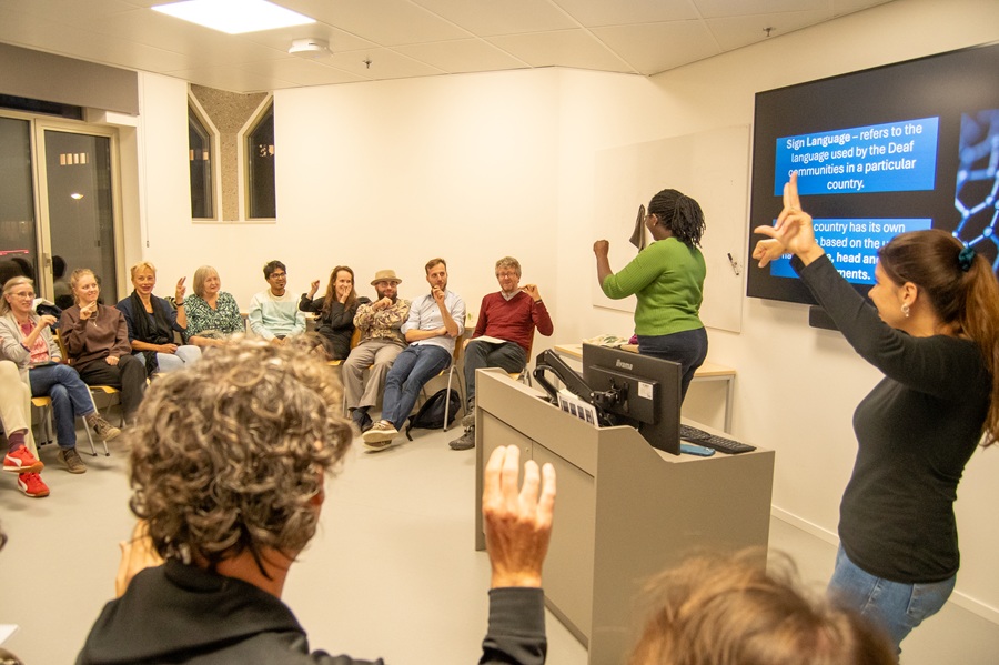 ‘Het evenement was absoluut fantastisch, een avond vol energie, nieuwsgierigheid en humor. Het was echt inspirerend om zoveel deelnemers te zien die enthousiast waren om Gebarentaal te leren, te delen en de schoonheid van verschillende talen en culturen te vieren. We verlieten de avond vol energie, inspiratie en dankbaarheid voor zo’n bruisende gemeenschap.’