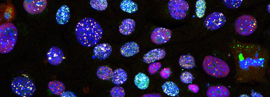 Over de afbeelding: de foto toont cellen van een muis met borstkanker. Elk licht stipje markeert een plek waar DNA-schade wordt hersteld. Met speciale antilichamen die herstel-eiwitten herkennen, kunnen wetenschappers volgen hoe cellen kapot DNA opsporen en repareren.