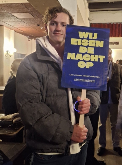 Onder de demonstranten waren ook veel mannelijke studenten zoals Roemer. Waarom liep hij mee? ‘Ik ken iemand die een keer iets naars heeft meegemaakt en dat maakte zeker indruk. Daarom loop ik ook weleens met vriendinnen mee als het al laat is. Mijn vereniging Minerva meldt het ook in de app als er iets gebeurt en benadrukt dat we goed op elkaar moeten letten.’