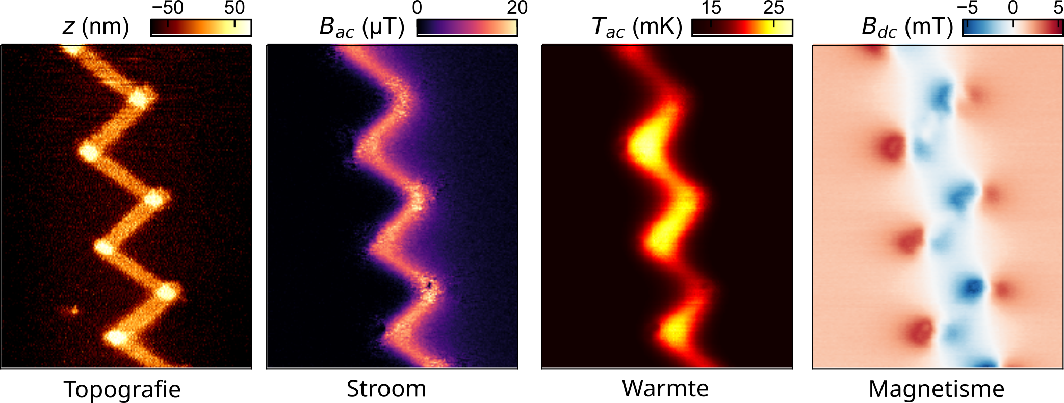 Warmte, magnetisme, structuur en elektrische eigenschappen. Dit zijn de materiaalkenmerken die deze nieuwe microscoop in beeld brengt. ‘Het voelt bijna alsof je een superkracht hebt’, vertelt Matthijs Rog, promovendus in de onderzoeksgroep van Kaveh Lahabi. ‘Je kijkt naar een preparaat en ziet niet alleen de vorm, maar ook de elektrische stromen, warmte en het magnetisme erin’.