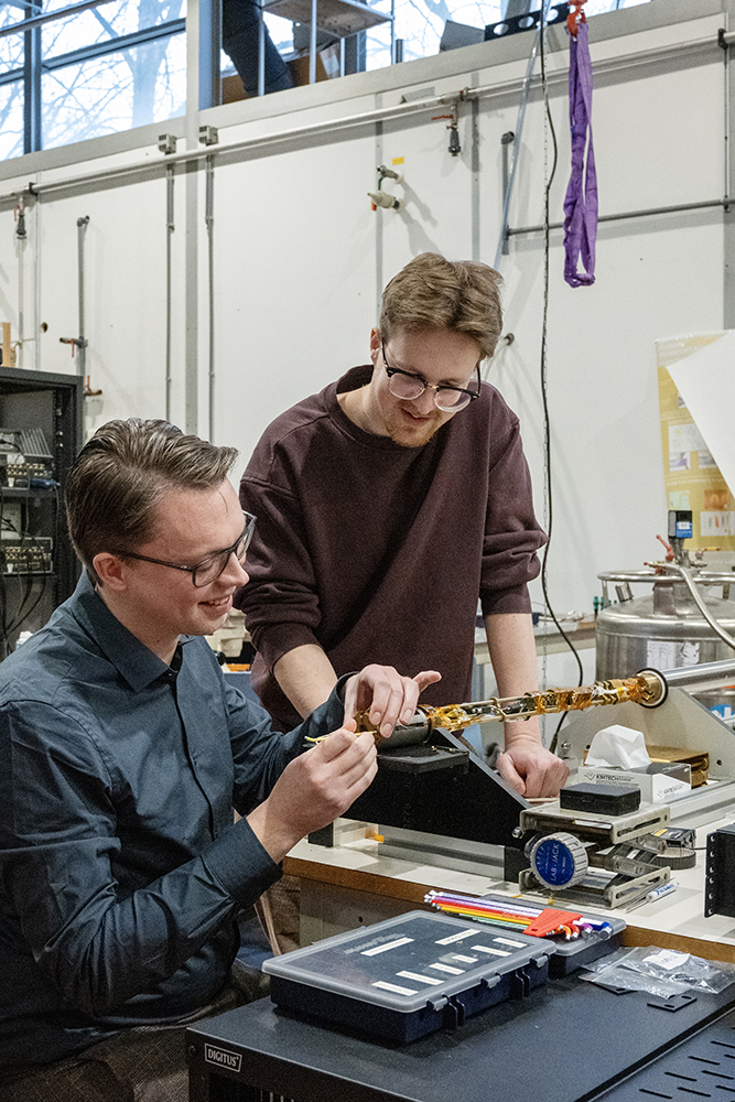 Promovendi Matthijs Rog en Tycho Blom monteren de tip op de microscoop -