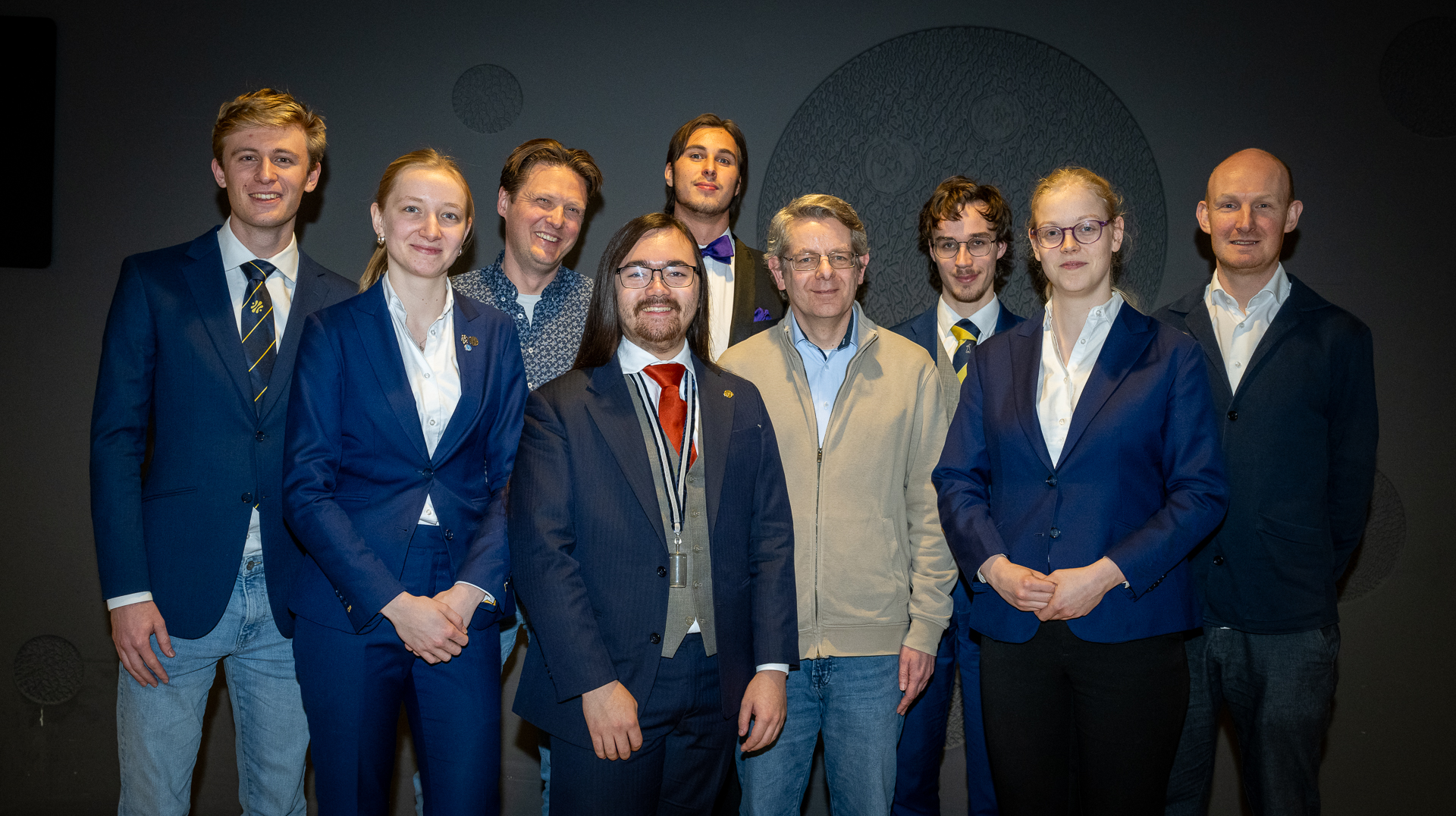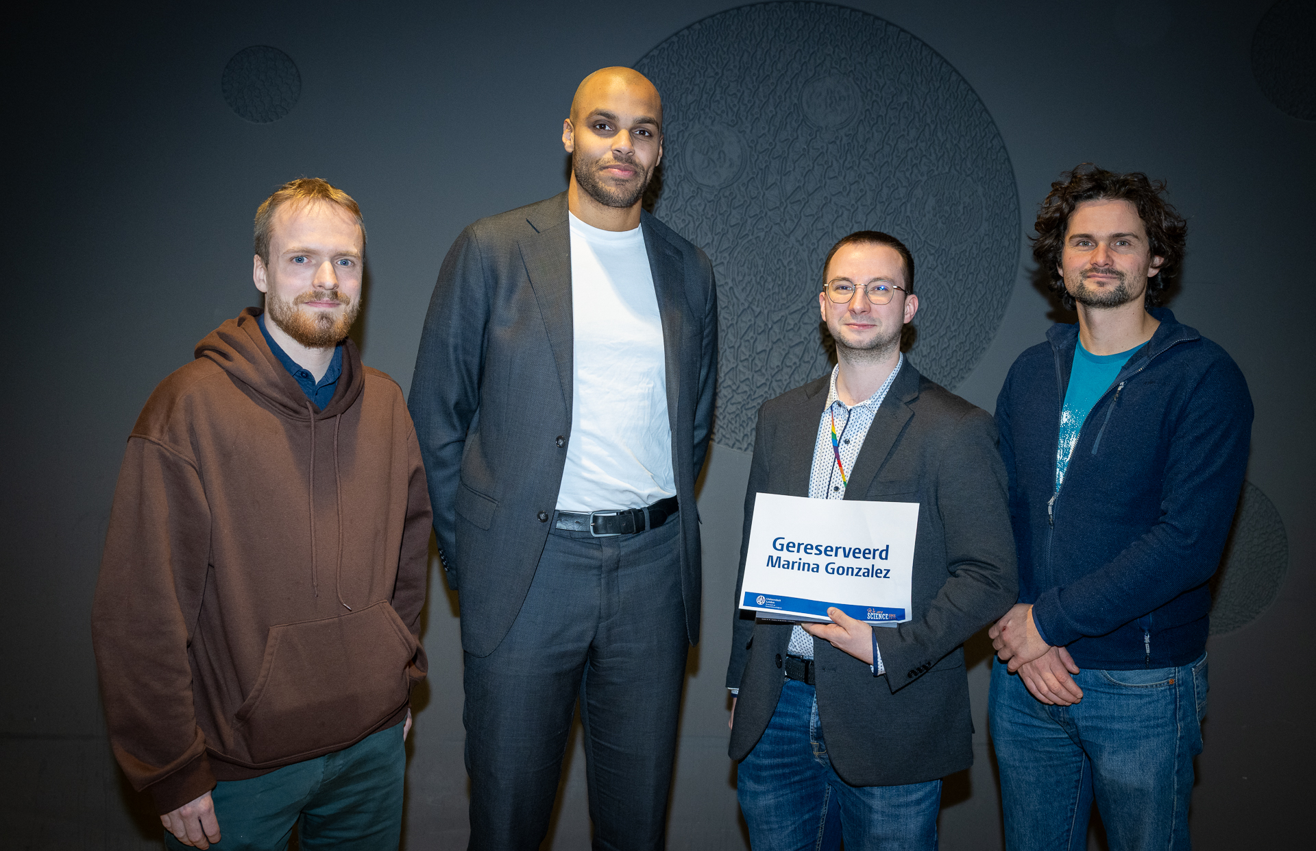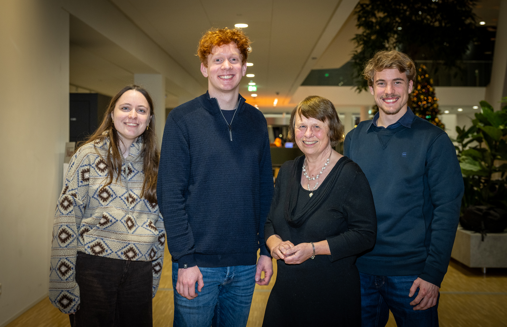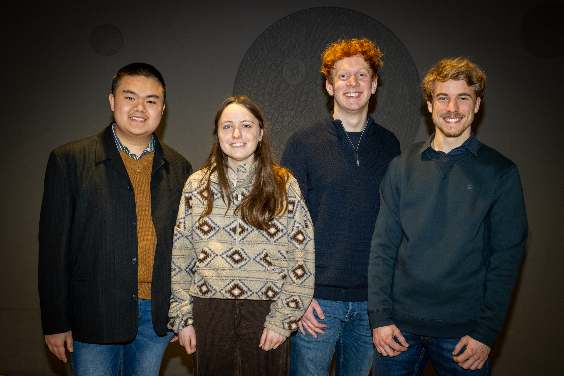 Een deel van de genomineerde bachelorstudenten, van links naar rechts: Lance Bakker, Femke van Dijk, Jelle Oonk (winnaar) en Jonas Bergwerff -