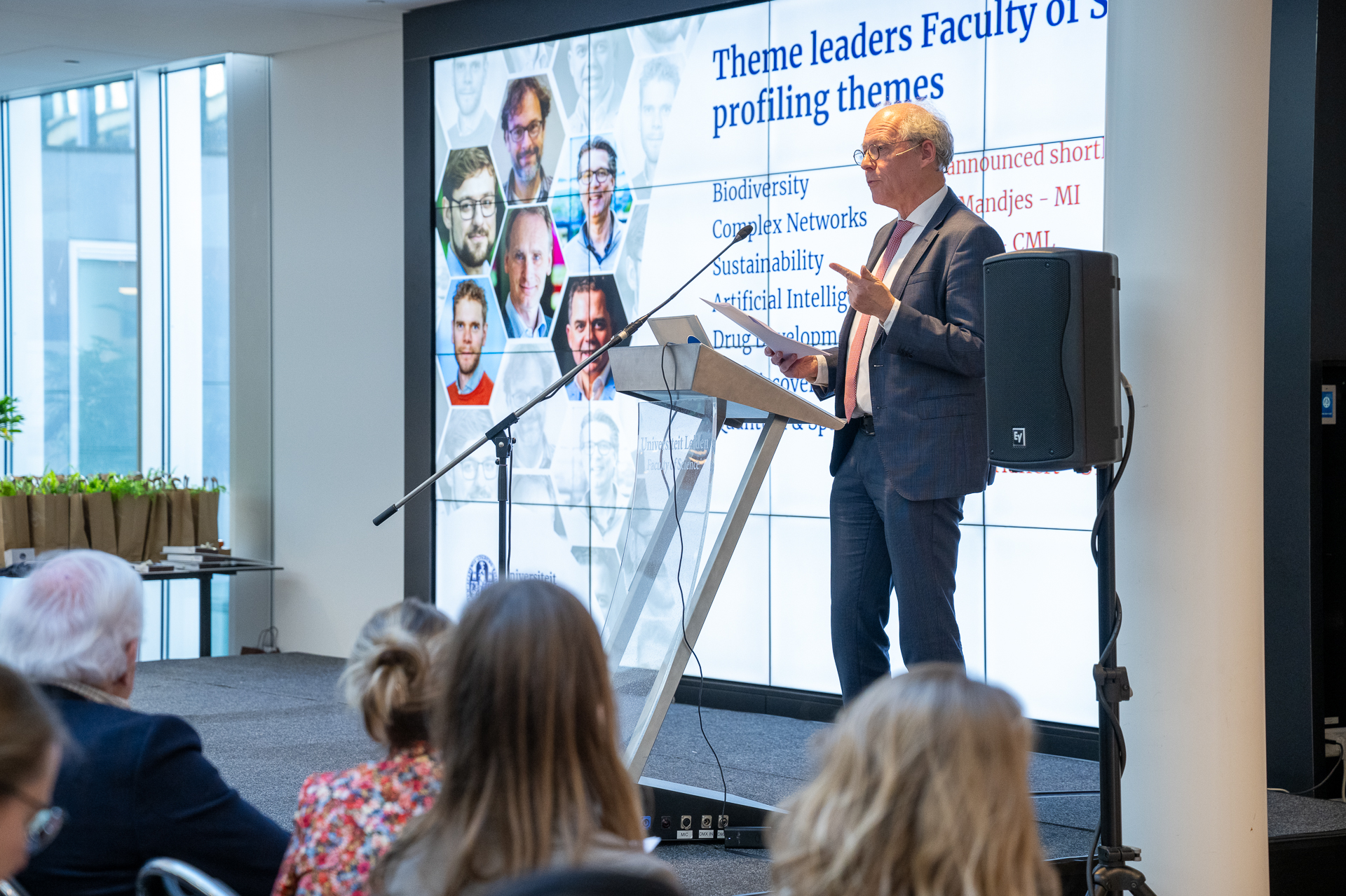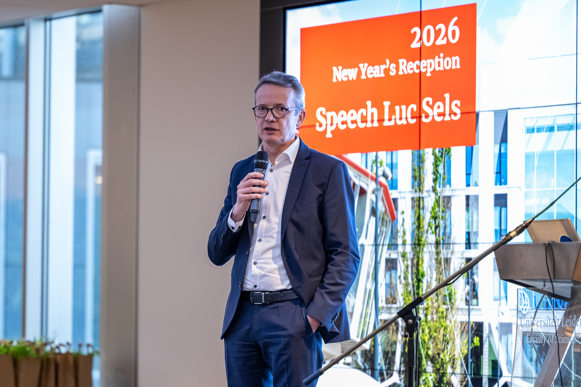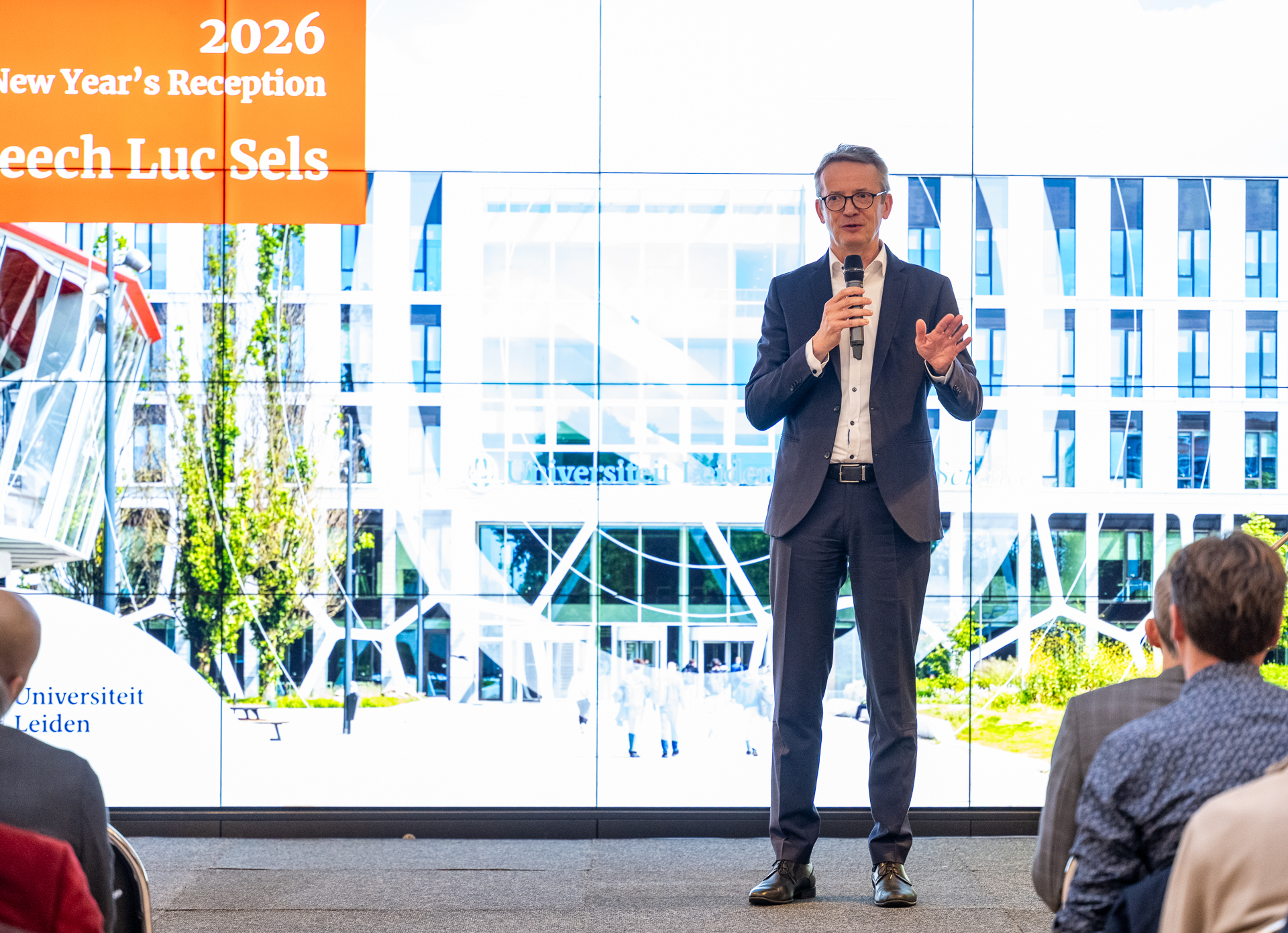 In het atrium van het Gorlaeus Gebouw startte decaan Jasper Knoester de nieuwjaarsbijeenkomst. Ondanks de sneeuw was de zaal goed gevuld. Knoester sprak over de huidige tijd van verandering en onzekerheid en onze rol als universiteit daarin.