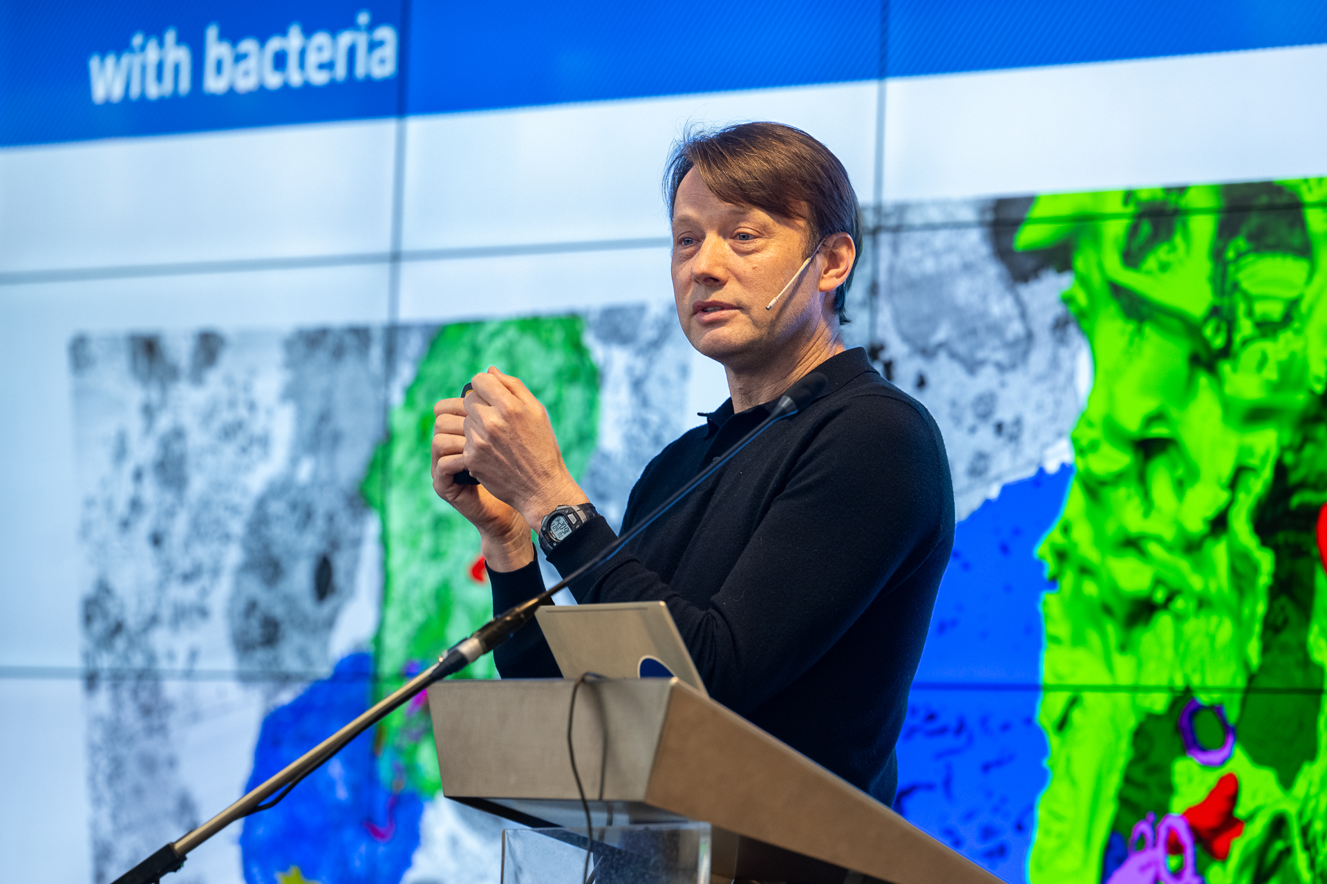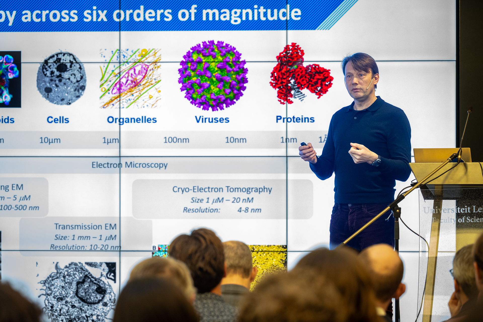 Daarna was het woord aan Meindert Lamers, hoogleraar Structuurbiologie en directeur van NeCEN, het Nederlandse centrum voor cryo-elektronenmicroscopie dat gehuisvest is in het Gorlaeus Gebouw. Lamers straalt als hij over zijn werk vertelt. Onderzoek doen met hypermoderne microscopen naar de structuren van eiwitten is voor hem ‘the really cool stuff’. ‘Door die proteïnen te bestuderen, onderzoeken we het leven vanaf de start’, betoogde Lamers. ‘En dat helpt onderzoekers om nieuwe medicijnen te ontdekken.’
