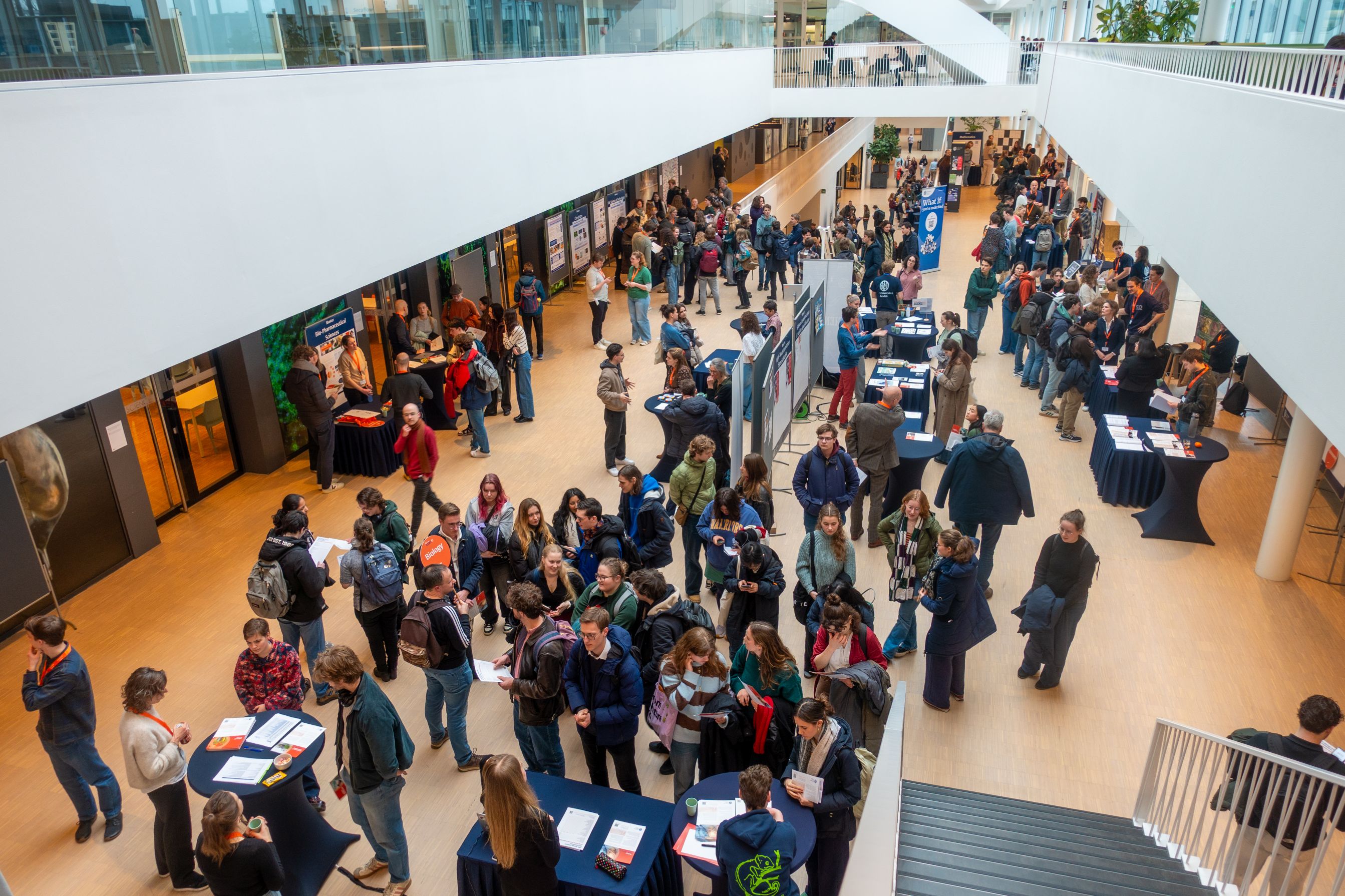 In de hal van het Gorlaeus Gebouw staan de stands waarbij uitleg wordt gegeven over de verschillende masters. -