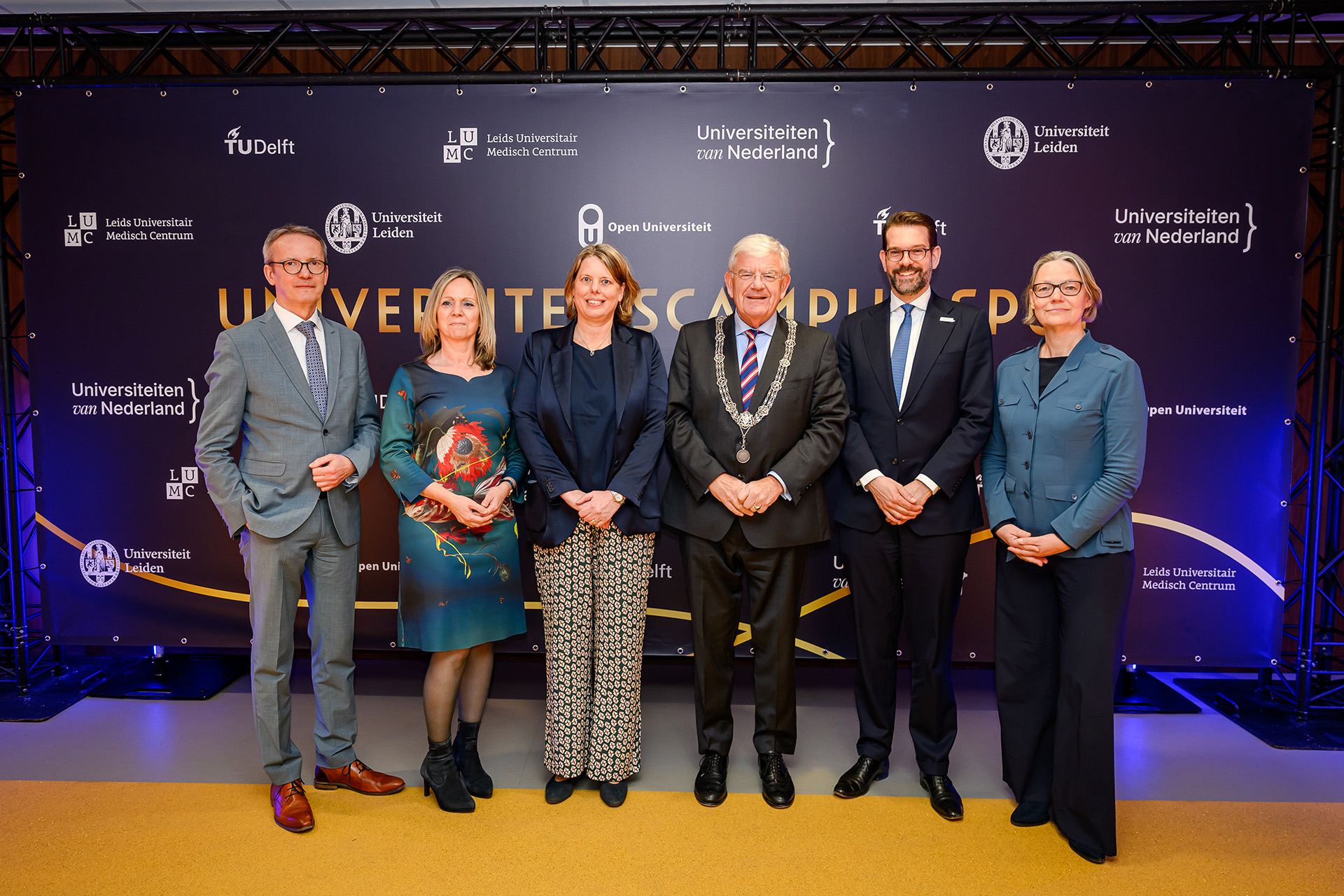 Trots lopen de vijf bestuurders en de burgemeester met hun puzzelstuk de zaal van hun nieuwe onderkomen binnen. Luc Sels (Universiteit Leiden), Hester Bijl (TU Delft), Marlies Reinders (LUMC), Nicole Ummelen (Open Universiteit) en Caspar van den Berg namens de Universiteiten van Nederland. De officiële openingshandeling symboliseert het gemeenschappelijk doel: samenwerking met elkaar, verbinding met de stad.