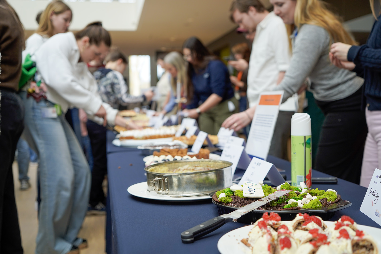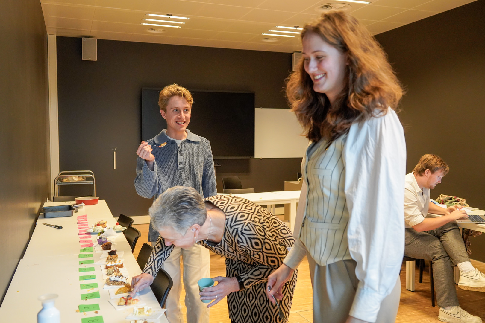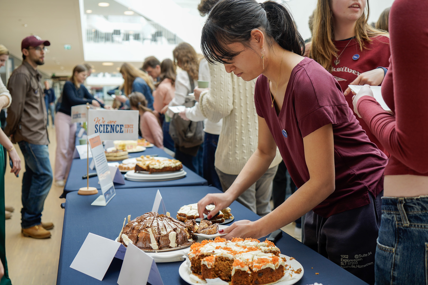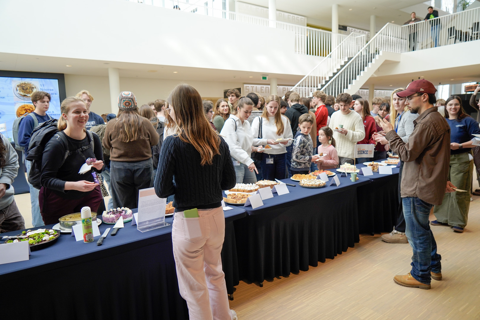 Al snel vulde het atrium zich niet alleen met taartenbakkers, maar ook met proevers. Ruim 150 mensen – vooral studenten – stonden in de rij voor een gebaksbordje, waarmee ze een aantal kleine stukjes konden opscheppen.