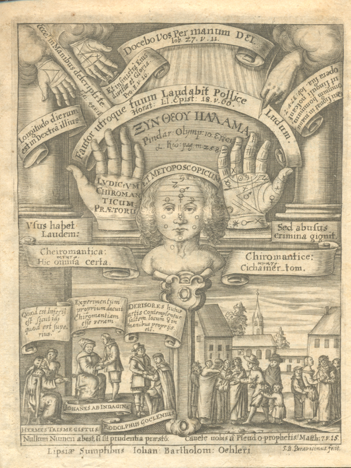 Titelpagina van Ludicrum Chiromanticum Praetorii (1662), het standaardwerk over palmlezen (Leiden, UB, 530 E 1)
