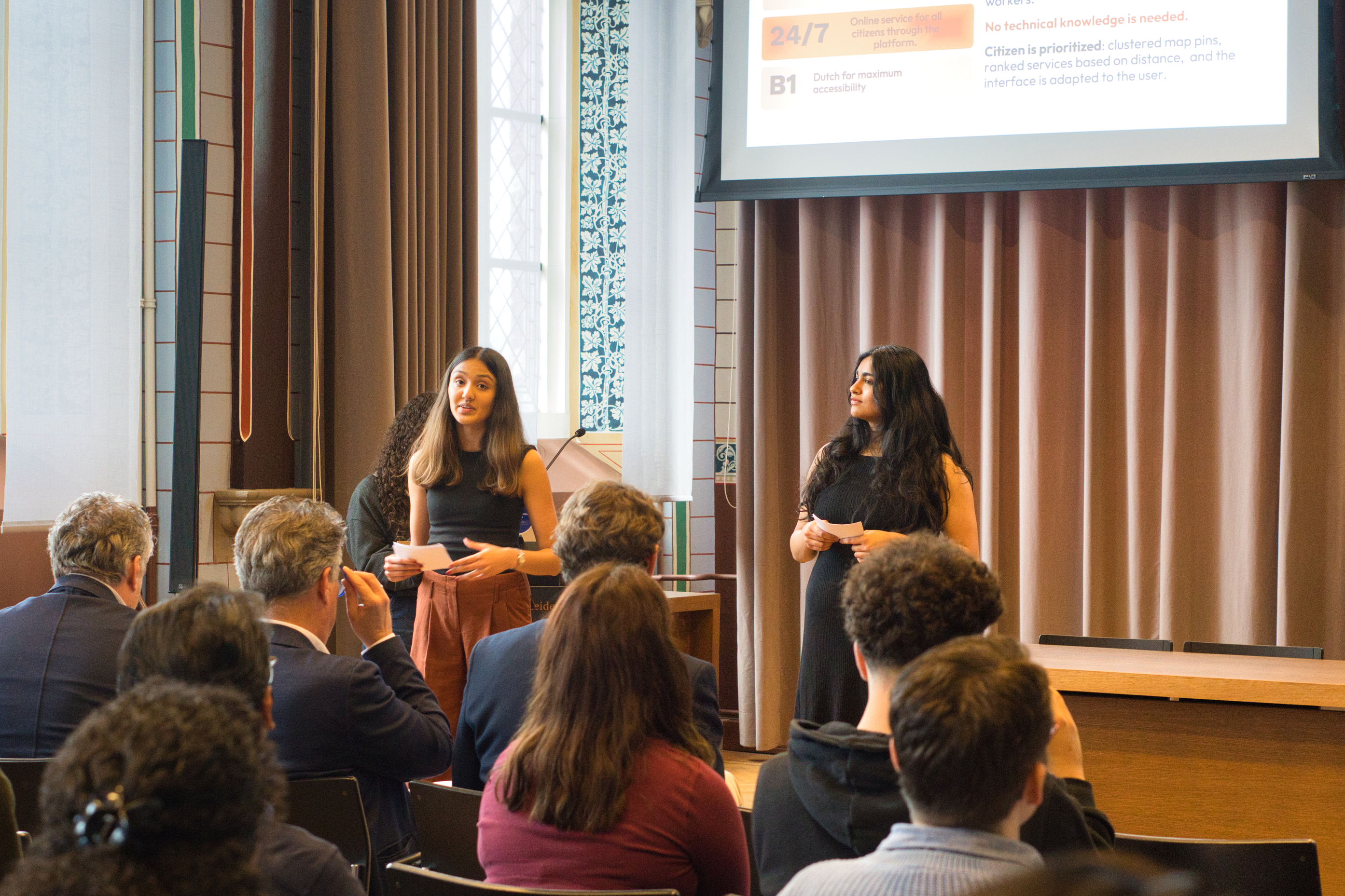 De eerste prijs werd in de wacht gesleept door Team 1, met studenten Simar Suri, Mia van Gellecum, Nicole Stafanov, Tanisha Sandeep Phadke, Ana Fadul Ramos en Lucas Danielian. Zij ontwikkelden een sociale kaart voor de Gemeente Leiden. Hiermee kunnen gebruikers makkelijk zien welke sociale voorzieningen ze recht op hebben. Hiermee wonnen ze de hoofdprijs van €3.000.